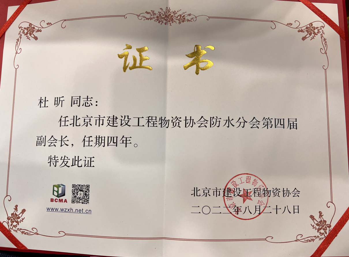 • 杜昕任北京建設工程物資協會防水分會副會長